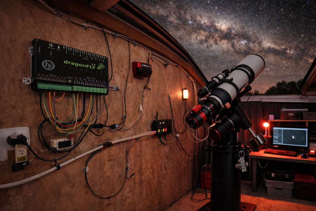 It can operate as a stand-alone controller, communicating via USB or WiFi using standard ASCOM and INDI drivers, or be integrated into a larger observatory control system together with Dragonfly or Starling.