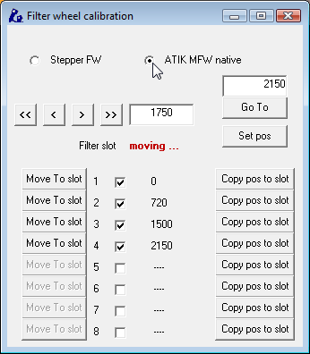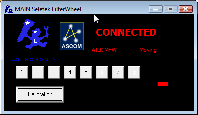 ... and select “ATIK MFW native”; the motor will start moving immediately searching for filter number 1. The rest of this window becomes meaningless, so go back to the main one closing this window (no problem to do this while the motor is moving).