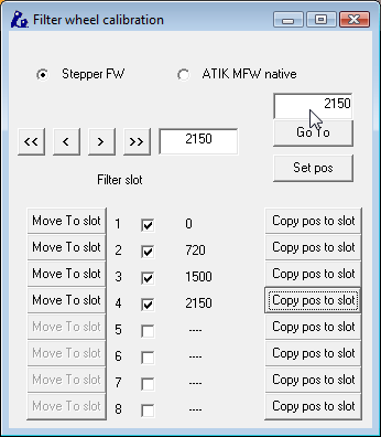 Our goal here is to move the motor until filter “1” is centered in the optical window; I suggest then setting the position to “0” (enter “0” in the upper right field and pressing “Set pos”), and clicking “Copy pos to slot” for the filter “1” (first row). The check box for the first filter will be marked, and the button “Move to slot” will be enabled.