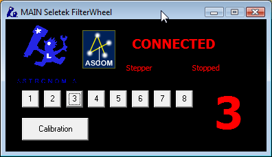 Please note! Stepper motors do not offer any way to check if they are powered or hooked or not – operating the filter wheel control with the filter wheel not properly connected will not result in any warning, but the position shown will not be physically correct. |