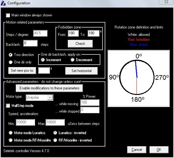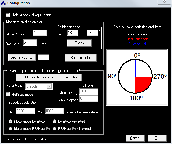 For the advanced parameters, please refer to the " Configuration window " in the focuser documentation, just bear in mind if you are using any rotator equiped with a Robofocus motor, you'll have to select this motor model here. Just of mention here is the existence of Min and Max speed fields (in usecs between steps, so Max will always be equal or lower than Min!). When commanded to move the motor will start at Min speed and accelerate to Max.