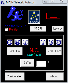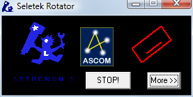 The "STOP! " button will stop inmediatly any motion of the rotator, and the "Less << " will hide the lower part of the window, most useful for ASCOM users so the screen if less cluttered.