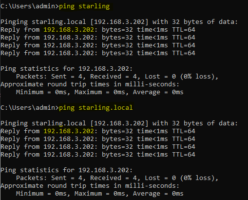 Tip! On occassion Windows will decide to show you the IPv6 address of your Starling, instead of IPv4, which is the one we use with the device. In that case, use ping -4 starling to force it to show you the IPv4 address.