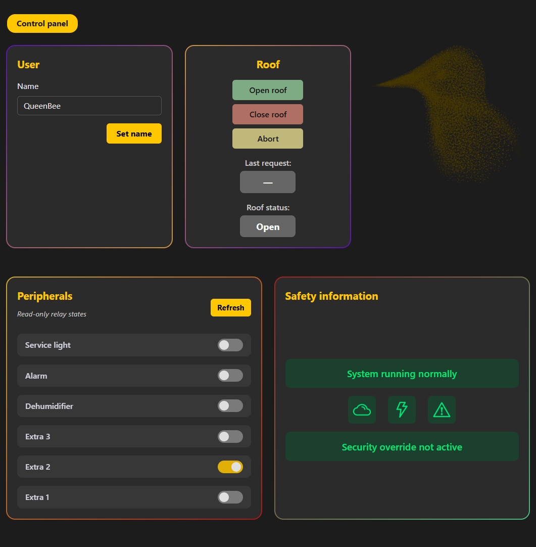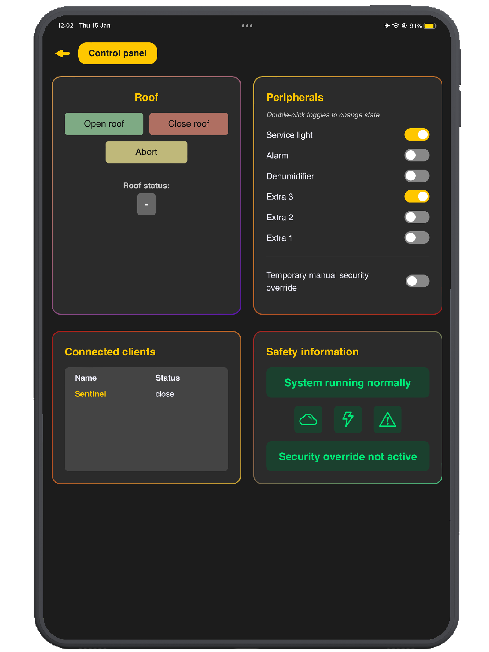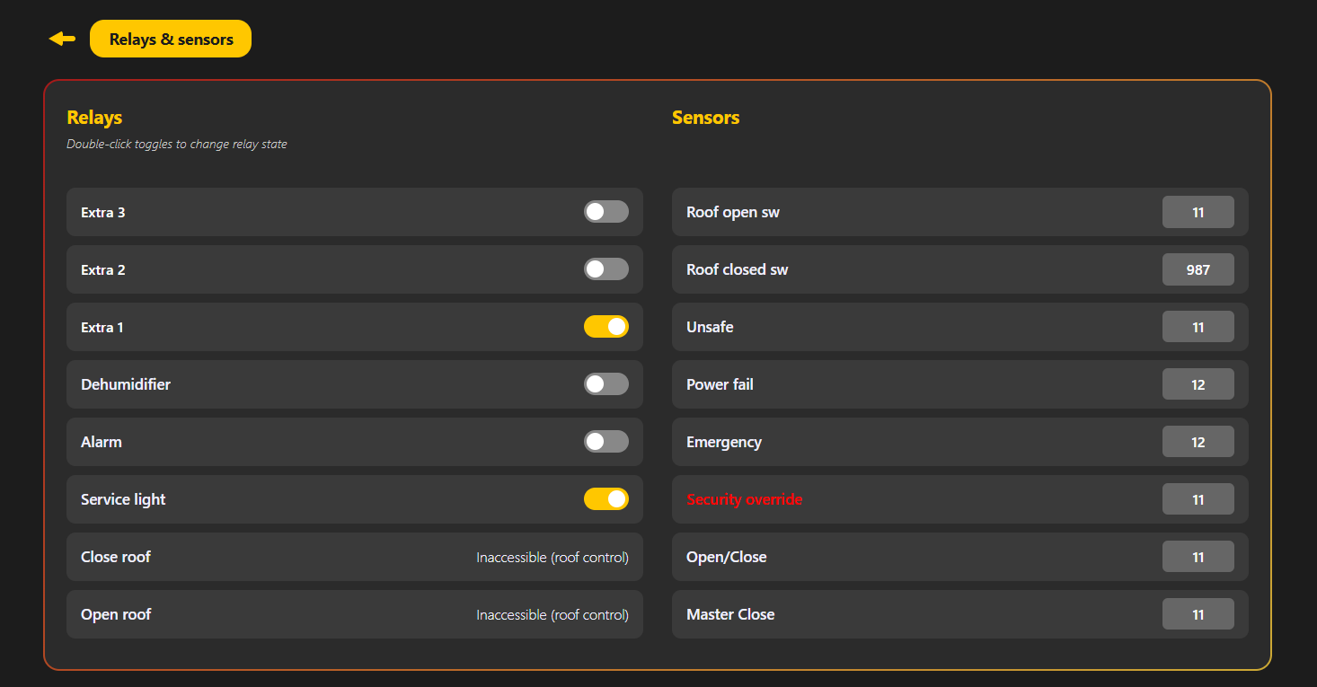 - override safety conditions and operate manually (open/close the roof or trigger outputs when required)