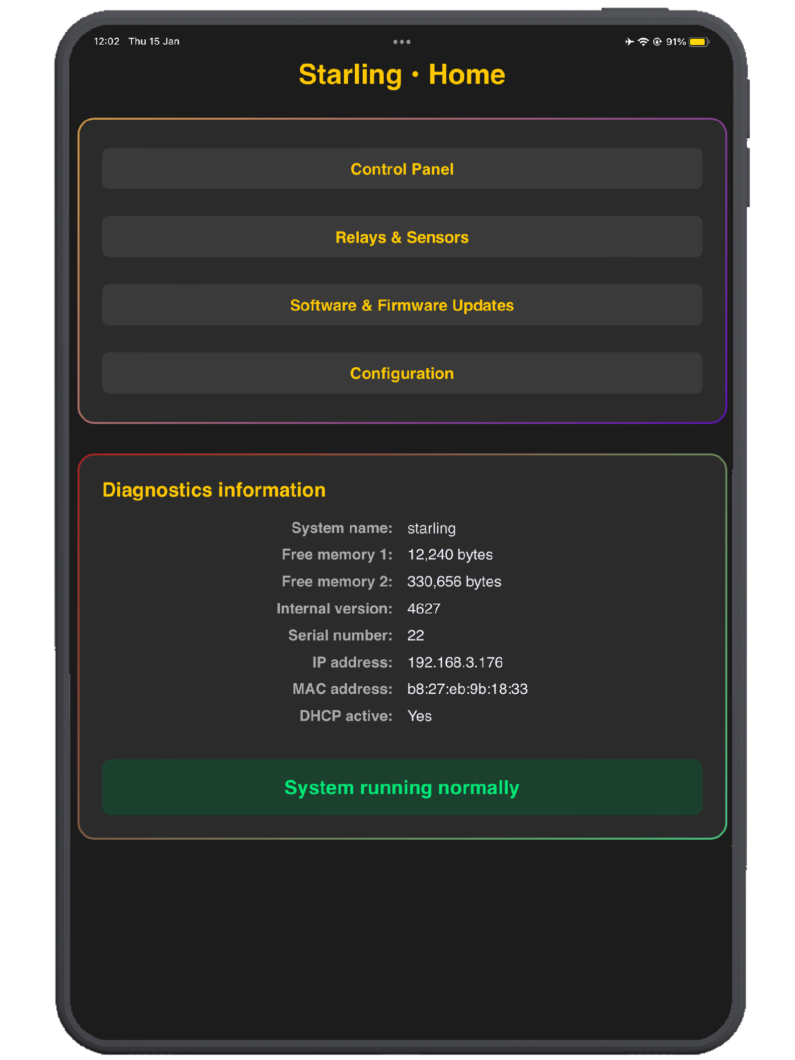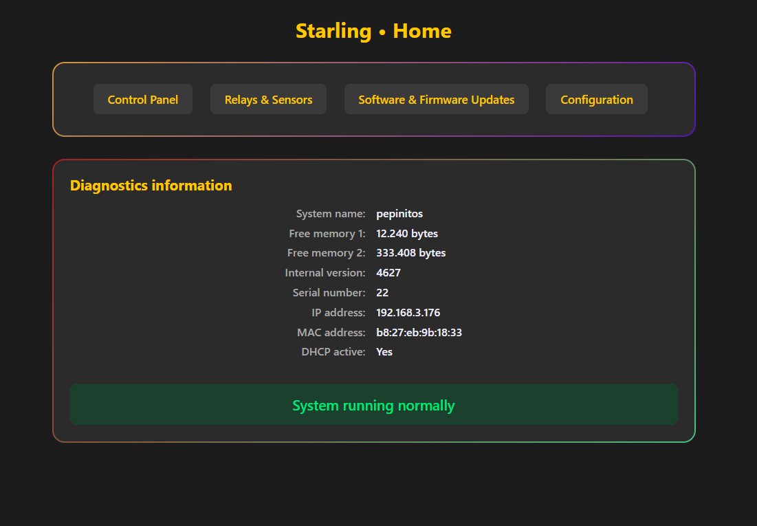 Starling supports local manual control using physical buttons or switches, enabling essential actions without a PC.