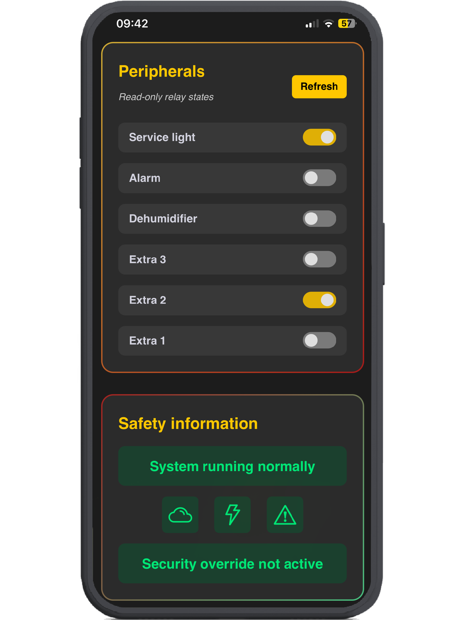 This is especially useful during maintenance, allowing an operator to open/close the roof, turn the service light on/off, or activate configured outputs directly on site.
